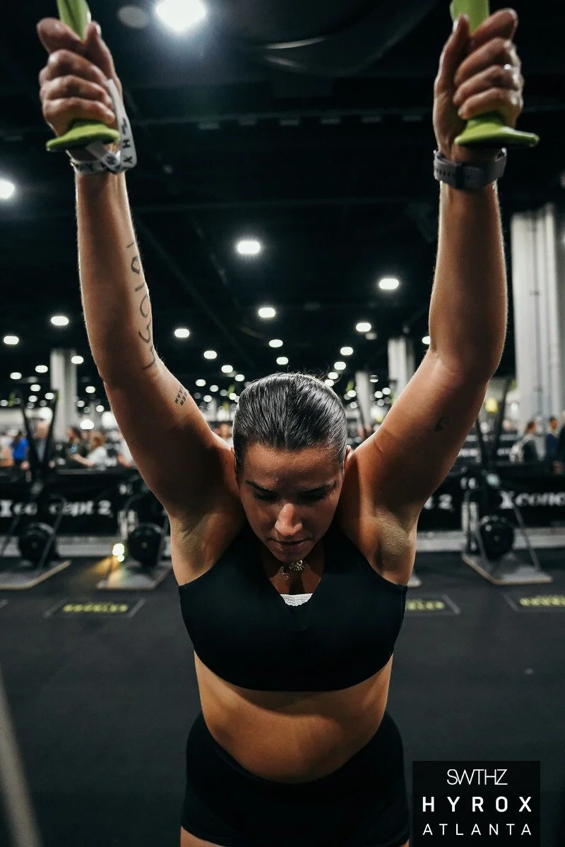 About 1-2 weeks before race day, Hyrox will publish a map with each station, spectator areas, the laps you’ll need to run, and more. About a week before, you’ll receive your individual start time and heat. The Atlanta Hyrox was broken out into Saturday and Sunday with non-stop heats, so the convention center was roaring with excitement the entire weekend, although it can be overwhelming and intimidating upon arrival. My heat started on Saturday the 26th at 4:30pm. They recommend you arrive at the convention center at least an hour and a half before your start to check in, get your tracker hooked up, warmup etc. It’s fun to cheer on the other athletes and get your bearings. However, I admittedly didn’t feel great after watching the fittest people I’ve ever seen, huffing and puffing their way through each station.